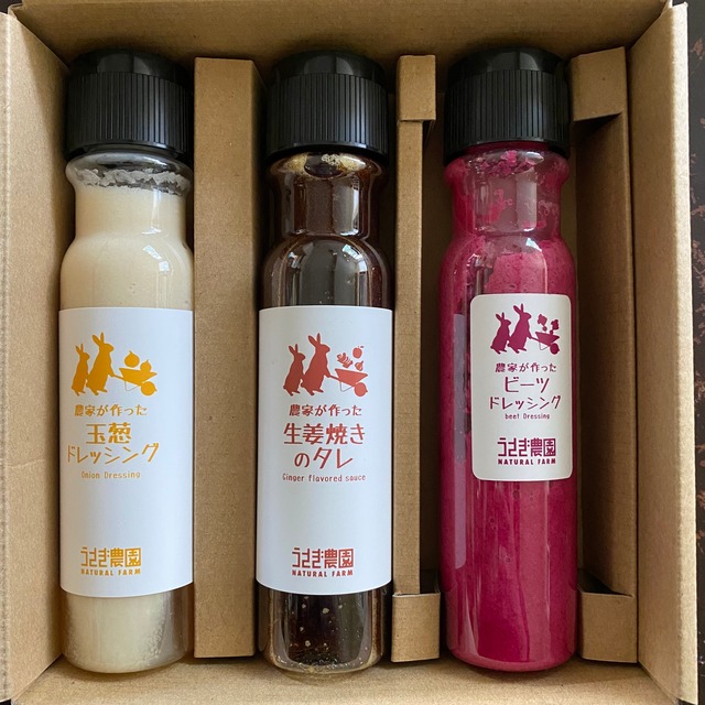 うさぎ農園の人気者を集めた ボトル3本セットです 玉ねぎドレッシング ビーツドレッシング 生姜焼きのタレ ※ギフトBOX代込み ※パケージが写真から変更となっておりますのでご了承くださいませ